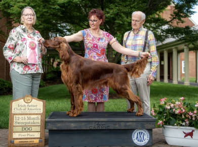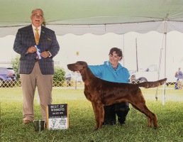 Tyra, from the " Super" litter finished her championship at 16 months from the bred by class. She finished at the Golden Triangle Irish Setter Specialty under respected Irish Setter breeder Judith Zawikowski. Tyra won her 12-18 class at the 2011 National in Oklahoma. Tyra had her first litter of puppies July 24 2013. 6 handsome males and 6 gorgeous female. We look forward to watching them grow.