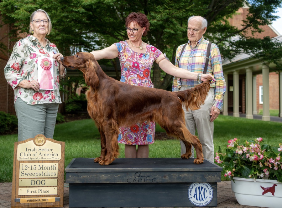 Kramer is pictured at 4 months.Winning his first Best Puppy in show!!! This looker is from the late Parker and Madge. We are excited to bring back a pedigree from 1998. Kramer easily finished his championship fro the bred by class and at 12 months old. Kramer won his sweeps class at the 2025 national- pictured. Kramer needed something to do when finished and went to go live with Catheryne and Tom Houston (ISCA members) in Atlanta GA. Kramer will be health tested when age appropriate and collected for freezing.