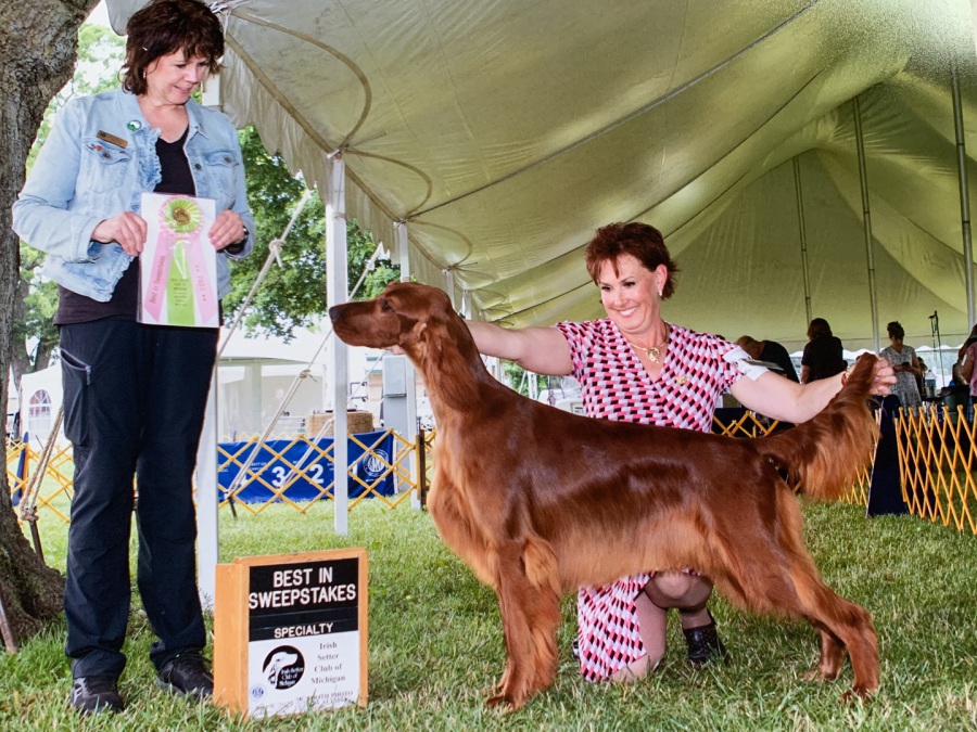 Kendall finished her championship and went to live with Sue Bailey in Indiana. Sue had lost her Irish and was looking to fill the void. Kendall is getting to be spoiled and be an only dog.